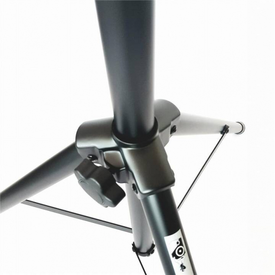 Statyw wykonany z metalu, pomalowany metodą proszkową w kolorze czarnym waga produktu z opakowaniem 4,20kg waga produktu bez opakowania 3,90kg rura nośna o przekroju 35mm udźwig do 50kg minimalna wysokość 124cm maksymalna wysokość 198cm podstawa trójnóg odstępy pomiędzy nogami 100cm długość nóg 70cm nogi o przektoju 35mm dociski stalowe z pokrętłami gwint 8mm dodatkowe zabezpieczenie bolec-przetyczka