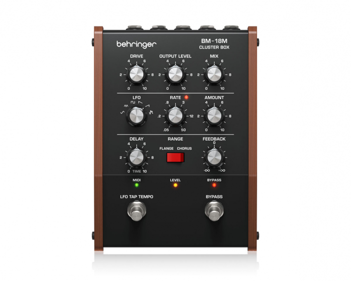 BM-18M CLUSTER BOX oferuje rozbudowany układ sterowania, zaprojektowany z myślą o intuicyjnym kształtowaniu brzmienia. Potencjometry Drive i Output Level, pozwala uzyskać nasycone analogowe ciepło lub nawet bardziej agresywny charakter efektu. Regulacja miksowania sygnału przetworzonego i czystego oferuje pełną kontrolę nad intensywnością końcowego efektu. Sześć opcji kształtów LFO pozwala tworzyć bogatą modulację, a kontrola takich parametrów jak Rate, Amount, Delay i Feedback oferują szeroką paletę sposobów kreacji brzmienia, zaś przełącznik nożny tap-tempo ułatwia utrzymanie pełnej kontroli nad rytmiką zastosowanych efektów.