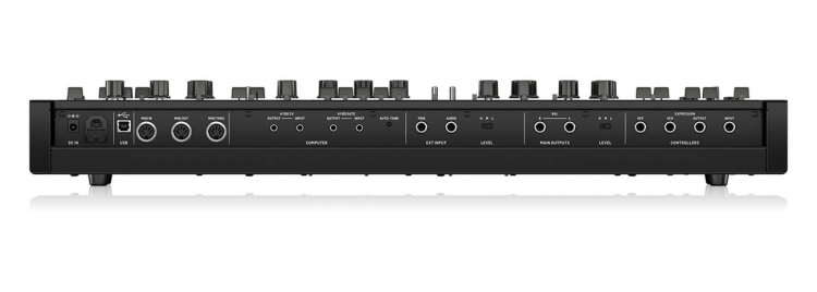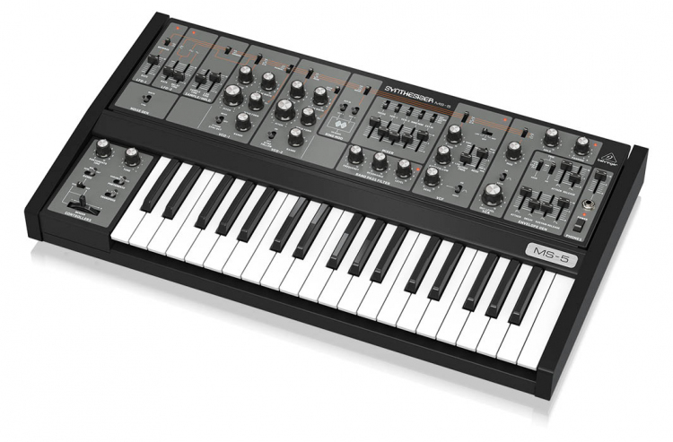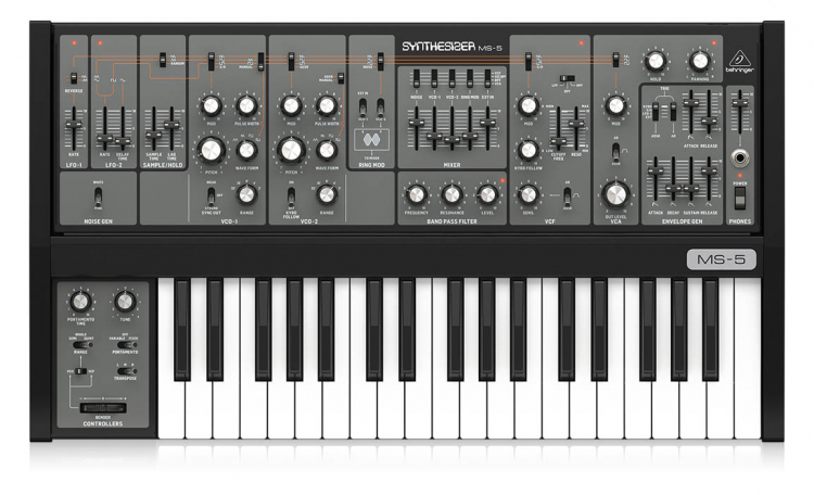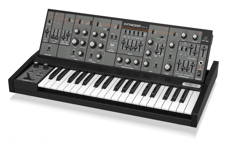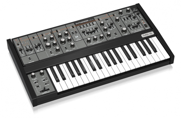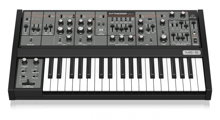 Behringer MS-5 – Analogowy syntezator z 37 pełnowymiarowymi klawiszami, 2 VCO, VCF z wieloma trybami, VCA, dwoma filtrami LFO oraz efektem typu Ring Modulator.
