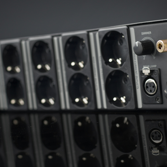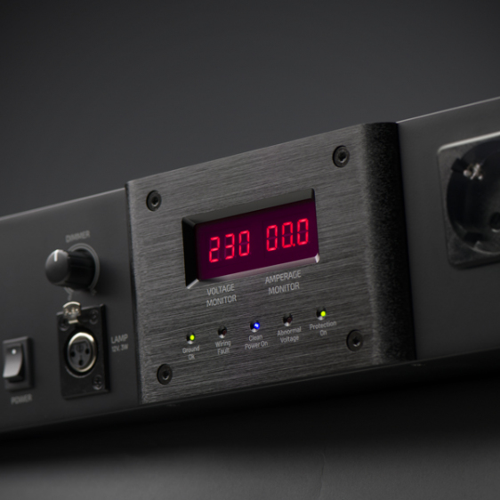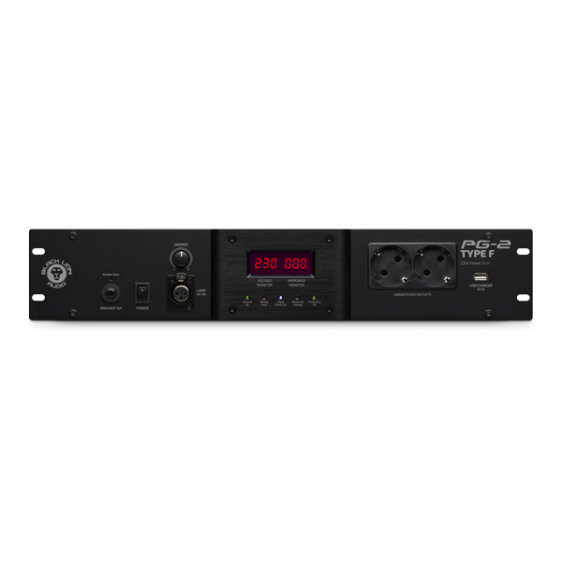PG-2 Rack Mount (2U) – profesjonalny kondycjoner zasilania z 12 chronionymi przed przepięciami gniazdami z wyłącznikiem i filtrem, miernikami napięcia i natężenia, które umożliwiają analizę na bieżąco, 2 gniazdkami z filtrem i portem do ładowarki USB na przednim panelu, wraz ze złączami XLR do lamp.