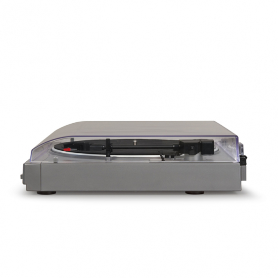 Półautomatyczny gramofon o napędzie paskowym, talerz z tworzywa sztucznego, gniazdo USB, w zestawie zasilacz, pokrywa, kable RCA oraz USB, kolor srebrny