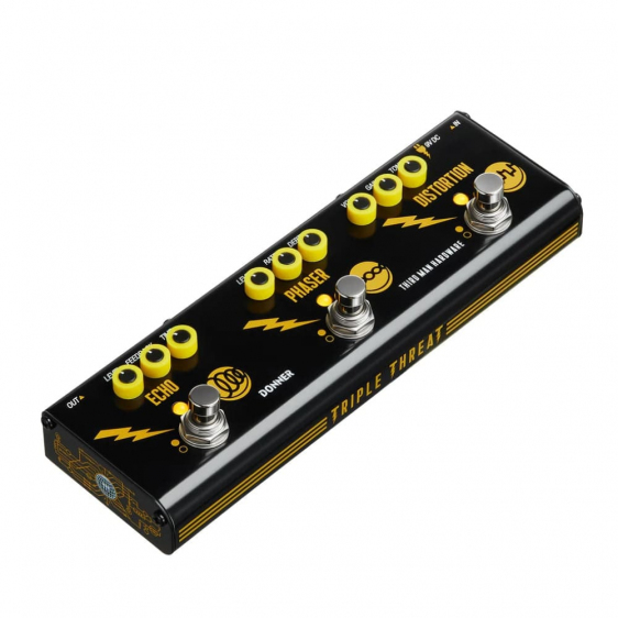 Efekt Donner Triple Threat został wykonany z wysokiej jakości aluminium, co zapewnia lekkość i trwałość. Precyzyjne pokrętła i przełączniki gwarantują niezawodną obsługę przez długie lata. Obudowa została zaprojektowana tak, aby wytrzymać intensywne użytkowanie podczas tras koncertowych.