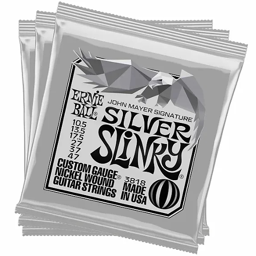 Ernie Ball 3818 zestaw 3 kompletów strun do gitary Silver Slinky. Rodzaj strun: Struny do gitary elektrycznej. Seria Slinky. Materiał rdzenia strun: Stal o kształcie sześciokątnym Powłoka strun: Niklowana Materiał strun gitarowych: Stal hartowana z wysoką domieszką węgla Zestawienie grubości strun .0105, .0135, .0175, .027, .037, .047 (10.5-47)