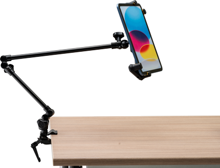 Pełny zakres obrotu: Uchwyt do tabletu jest wyposażony w przegub kulowy z wieloma punktami regulacji, które umożliwiają swobodny obrót ramienia we wszystkich kierunkach.